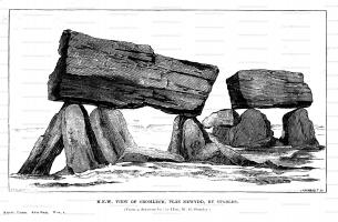 I append a list of known cromlechs and meinihirion in Anglesey, as far as I can ascertain them, with, the assistance of the Rev. W. Wynn Williams and the Rev. Hugh Prichard. Cromlechs existing in Anglesey. — 1, Plas Newydd [Map]; double. 2, Bryncelli [Map]; a tumulus, not sepulchral chamber. 3, Tumulus at Plas Newydd [Map]. 4, Bodowyr [Map]. 5, Trefor [Map], double. 6, Lligwy [Map]. 7, Bodafon. 8, Llanfechell [Map]; top stone fallen. 9, Henblas [Map]; query, whether artificial or natural, probably the latter. 10. Ty Newydd [Map], Llanfaelog; double. 11, 12, 13, Crigyll; three small cromlechs. 14, Mynydd y Cmvvc, Llanfaelog. 15, Trefigneth; triple. 16, Presaddfedd. 17, Pant y Saer [Map]; lately destroyed. 18, Treban, Ceirchiog. 19, Tref Arthur, Holyhead; a few stones remain. 20, Cromlech at Rhoscolyn [Map], Llangeinwen; a few stones remain. 21, at Tan twr and Caer-llechau some stones remain. 22, Lon Caerau Mawr; ditto. 23, Perthi-duon, Llanidan; fallen. 24, near Plas-bach, Trefdraeth; a few stones remain.