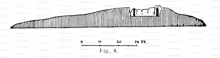 Trial holes were made in various parts of the mound to ascertain if there had ever been anything in the nature of a retaining wall, surrounding upright stones, or a ditch, but nothing of the sort was disclosed. A number of large upright slabs facing east and west were found on the north side of the axis at the narrow end of the mound, about 4 ft. apart, which appear to have only answered the purpose of strengthening the mound. Close to one of these slabs was found a small pocket of stones containing charcoal. Nothing in the nature of a passage-way or approach was discovered leading up to the cist.