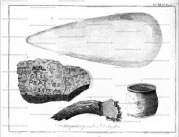 N° 1. PI. II. was found in November, 1791, in the same valley, and about three feet under ground; this very singular-shaped instrument appears to be marble, of a light colour, tinged with yellow, and a mixture of pale red and green veins, and, what is very extraordinary, it still retains a sine polish; the edges are thin, rising gradually to about the thickness of half an inch in the middle; from its shape and size it could not have been used as a weapon, but I think it might very possibly be the instrument used by the Aruspices, who examined the entrails of the victims that were sacrificed, which were always carefully surveyed.