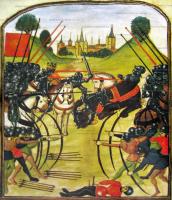 4th May 1471. Intelligence of this being brought to the king, he instantly pursued them with his whole force, and made so rapid an advance, that on the 3d of May he came within three miles of Tewksbury, and there lay encamped in the open fields: the following morning, the king moved forward in the finest order, and came before the town, where he found the rebels drawn up and marshalled in a wonderful strong position. The king hereupon recommending his cause and quarrel to our blessed Creator, attacked on the 4th day of May, and, through the aid of our blessed Creator, obtained a victory over his said rebels. In the battle, Edward, the brother-in-law of the aforesaid Duke of Somerset, called Marquis of Dorset, Earl Bourchier, and the Lord Wenlock (age 71), with many other noble knights and squires, were slain; and there were made prisoners, Edmund (age 32), stiled Duke of Somerset, the Prior of Saint Johna, with divers other knights and squires.