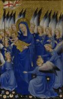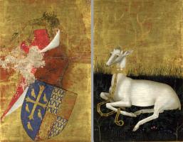 It is painted on two tablets, and Hollar engraved it in two plates in the year 1639; but the two when viewed together form but one design. The King is kneeling in prayer to the Virgin and her Son; behind him stand the three saints, John the Baptist, Edward the Confessor, and Edmund the King. Behind and around the Virgin are eleven angels. King Richard is here attired in a gown powdered with White Harts, which are interlaced with Broom-cods running in the same manner as the interlacing foliage on the mantle of his Effigy. He wears round his neck a collar of Broom-cods; and on his left shoulder is his badge of the White Hart. But what is more extraordinary is, that each of the eleven angels wears a similar collar and a similar badge. It must be remarked that the pendant to the collar in front, in every case, is formed of two of the Broom-cods only; and that the King, as well as the angels, wears the White Hart, as a badge, on his shoulder, not as a pendant to the collar, as was misapprehended by Anstisg. It was this picture which furnished a subject of discussion to Walpole in connexion with the alleged discovery of oil-painting by Van Eyckh; but it was proved to be painted in water-colours, on an examination by T. Phillips, Esq. R.A. as is noticed in Britton's Beauties of Wiltshire. It formerly belonged to the Royal Collection, but is said to have been given away by King James the Second to Lord Castlemaine, about the time he went Ambassador to Rome, after whose death it was purchased by the Earl of Pembroke, and added to the Collection at Wilton.