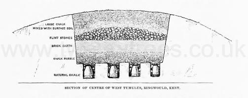 Excavations were commenced by digging a trench in the western mound from the north-west side, through loose chalk mixed with surface mould. About the centre, at a depth of three feet, we came upon a deposit of human bones bearing traces of having been burnt on the spot, without pottery or other remains. Continuing our researches to the east we removed a heap of flint-stones, which extended laterally for about ten feet each way; below the stones was a layer of brick-earth, amongst which fragments of charcoal occurred, and beneath the brick-earth chalk rubble covered the natural chalk to the depth of one foot. Amongst the flints and above them were some bones and teeth of a horse.