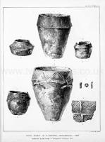 The accompanying section of the centre of the barrow will give an idea of its construction. On coming to the natural chalk we discovered the primary interments. Cylindrical cists had, in three instances, been dug to the depth of eighteen inches; in the fourth the chalk had been slightly undermined on one side of the cist, and a neatly arched niche formed for the reception of the urn; in each case the bottom of the cavity had been levelled with great care and precision, so that no interstices should intervene between the rim of the inverted urn and the soil below. The first which we uncovered contained the fragments of a large urn ornamented with a chevron pattern, the lines of which had been produced by impressing a twisted thong in the soft clay. No bones were found with this deposit. The second urn (No. 1 in the annexed plate), which stood inverted in the above-mentioned niche, was extracted nearly perfect; it is slightly ornamented with vertical lines on the overhanging portion of the top and is thirteen inches in height. It covered a heap of calcined bones. The next urn had been completely crushed by the superincumbent soil; it appeared to have been about sixteen inches in height and had handles, and an impressed pattern similar to No. 2. Within this crushed urn was lying a small cup (No. 4) of the rudest workmanship, the mouth of which was stopped with a lump of half-baked clay. A somewhat similar cup was found in Dorsetshire filled with small birds' hones. (Sec Barrow-diggers, a Dialogue, pi. ix.) A few fragments of bones, apparently those of an infant, accompanied this interment.