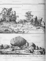 Plate XVII. N° II. is a view of a stone called Gorse Stone [Map], with Cat Stone at a distance marked I. This name is undoubtedly derived from a British word gorsed dau (setting aloft). Doctor Borlace says, in his Antiquities of Cornwall, that the Druids had places of elevation "called gorsed dau; in some places they were made of earth, and sometimes they were upon high rocks, from whence they used to pronounce their decrees." Now no place seems to be better calculated for that purpose, or for their inaugurations, than these stones; the other, which is the largest of the three, is called Heart Stone [Map], and measures eighty-three feet in circumference.