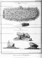 On Hathersage Moor in the high Peak, not far from the road that goes from Sheffield to Manchester, is a British work, called Cairs work [Map]. See the plan Pl. XIII. fig. 1. It is about two hundred yards in length, and sixty-one in width. It takes in an hill precipitous all round, except at the north end, where there is a wall of a very singular construcion. It is near three feet thick, and consists of three rows of very large stones. On the top are other large stones, set obliquely end ways, a view of which is in the same plate fig. 1. at b. The inside is filled up with earth and stones, which form the vallum, and slope inwards twenty-five feet. The height of the wall to the top of the sloping stones (as abovementioned) is nine feet four inches. The principal entrance seems to have been at the east end of the wall; a lesser one is on the west side; both marked (c) in the plan. The area of this work is full of rocks and large stones; several of these are rocking stones, three of which are engraved in Plate XIII. fig 2. (a) thirteen feet in length, (b) eight feet, (c) nine feet fix inches; and others have rock basons.