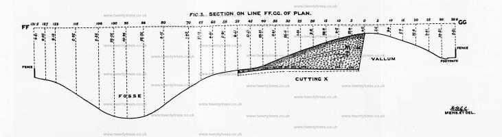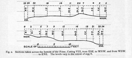 This section showed that the central plateau was 12 ft., and the crest of the vallum 31 ft. above the turf level of the fosse. After re-excavating the fosse the bottom was found to be 18.7 ft. deep below the surface of the silting on the E. margin, and consequently 49.7 ft. below the crest of the vallum. Supposing that the crest of the vallum was originally about 5 ft. higher, the total vertical height from the floor of the fosse to the summit of the embankment would not have been less than 55 ft.