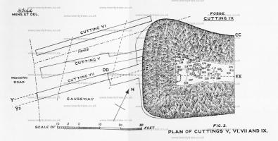 In the endeavour to ascertain the extent of the fosse in this position, we caused several trial-holes to be made eastward of Cutting II to follow the upper margin of the walls of the fosse. This was satisfactory as far as it went, and it was found that instead of the fosse narrowing, it widened as it approached the hedge and road. This was as far as we could go in this inquiry until Cutting III across the fosse was tackled subsequently (p. 117).