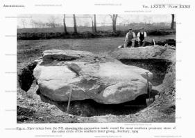 1909. Plate XXXII. Fig. 1. View taken from the NE. showing the excavation made round the most southern prostrate stone of the outer circle of the southern inner group, Avebury.