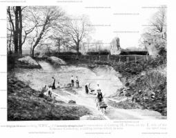 1909. Plate XXXVIII. Fig. 1. View of Avebury, taken from the S., showing some of the remaining stones of the great outer circle and of the inner southern group: also the excavations on the site of the Entrance Causeway on the right, and in the foreground the silting of Cutting III, Fosse, being removed in 1909.