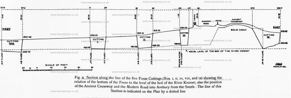 Both Aubrey and Stukeley apparently show the position of the Kennet Avenue entrance into Avebury as being on the site of the present road, and this fact rather fed us to suppose that the fosse on the W. side of the solid entrance-causeway must have terminated in about the position of the present W. hedge. But our excavation into the fosse of Cutting III proved that their plans are incorrect and misleading.