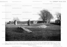 Note 2. The southern of the remaining stones is 17 ft. in height above the ground-level; it leaned in 1922 to the N. 33 in. out of the perpendicular; in 1881 there is a record that it overhung to the extent of 27^ in. The western stone is 14 ft. 7 in. in height, with a width of the same dimensions; in 1881 it overhung 15 in. The northern stone fell in 1713 and was broken up; it is said to have been 7 yards long.
