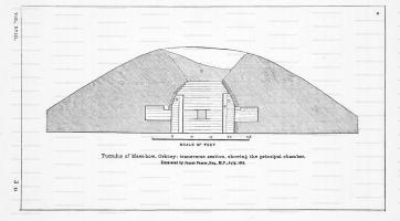 The Tumulus of Maes-how [Map] is situated about a mile to the north-east of the Ring of Stenness. Lieut. Thomas, in his Memoir on the Celtic Antiquities of Orkney, published in the Archæologia, describes it as the most remarkable tumulus in Orkney, and "called M'eshoo or Meas-howe;" it is a very large mound of a conical form, 36 feet high and about 100 feet in diameter, and occupies the centre of a raised circular platform, which has a radius of about 65 feet. This is surrounded by a trench 40 feet in breadth.2