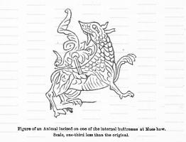 The figure of a lion or monstrous animal, with a singularly foliated tail, is cut on one of the buttresses (P, see the transverse section), and displays spirit and skill in its design (see woodcut). Beneath it are other figures—one of them has a resemblance to a serpent entwined around a tree or pole. The dragon is traced with more freedom of hand than the Runes, and there are no Runes on the edge of the stone on which it appears, except one or two rudimentary ones which are cut over the other figures.