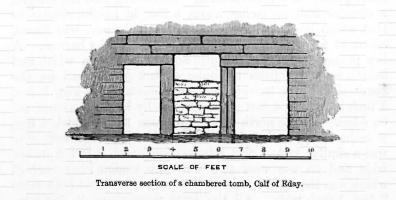 The discovery of similar figures on stones in a chambered cairn or barrow at Pickaquoy near Kirkwall, seems to point to a connection between such barrows and the Picts'-houses, if it does not prove that they are only varieties of the same class of structures; in short, that the so-called Picts'-houses are simply chambered tombs, which have been despoiled of their original contents at an early date.