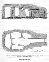 In the Calf of Eday, a small island, now uninhabited, there is what I consider another variety of the chambered tombs [Calf of Eday Chambered Cairns [Map]]. It is wholly subterranean, situated in the face of a slope, and it consists of a central chamber with four surrounding cells, formed by upright flagstones, with the usual passage from the outside to the interior. (See the accompanying ground-plan and section.) Beneath the outer extremity of the passage or entrance, a drain was discovered, indicated in the plan, and was traced some distance down the hill-side. The plan will show how closely the building resembles in its internal arrangements, not only the Bookan barrow, but also the so-called Picts'-houses. The same structural design evidently pervades the whole.