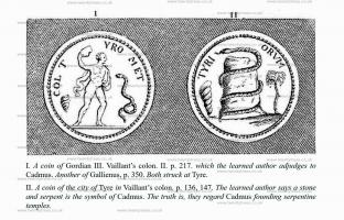 II. A coin of the city of Tyre in Vaillant's colon. p. 136, 147. The learned author says a stone and serpent is the symbol of Cadmus. The truth is, they regard Cadmus founding serpentine temples.