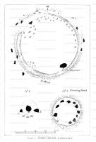 No. 6. Single Stone Circle. The disposition of the stones in this circle is well marked, there are seven of them in all, three or four of which, adjacent to each other, are upright and fixed. The plan represents a symmet rically formed single circle of 25 feet in diameter, the boulders have been set up on the ground in regular order to each other; there is no evidence of any pavement or cairn structure here, and the sod within the area, gives no indication of having been opened or disturbed.