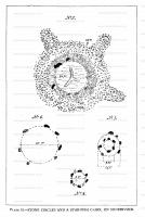 No. 13. Double Circle, "The Cockpit [Map]." This is a large prominent object, and it is well-known to those who frequent the common, under the name of the Cockpit. The remains are situated on a natural flattened ridge, and consist of a circular arrangement of boulder stones inclosing a flat area. It cannot be said to be perfectly circular, being slightly oval in circumference, the diameter N. and S. being go feet, and E. and W. 103 feet. As a plan has been furnished, (Plate IV), with the sizes of the principal stones given, and the distances between them, many of the details may be omitted in the description. A few of the stones are now doubtless dislocated from their regular bearings, some having fallen inwards and others outwards, but the observer can readily discern that there has been a carefully constructed peristylith of two rings of stones, an inner and an outer. Within the circumference there are the ruins of four segmental cairns or barrows. The most prominent of these is situated within the boundary on the E. side, where an earthern mound has been raised above the level of the plateau, and a circular cairn has been set upon it. The diameter of this heap is 24 feet, and the circular form is well maintained by stones averaging a foot square, of which about 70 remain, set in an approach to concentric arrangement. The circle at the foot of figure 1, consists of eight or ten stones in their places, and has a diameter of g feet. The cairn situated under figure 16, is flattened and nearly demolished; that under figure 15, shews the cairn structure piled up with loose stones, and so elevated above the surface.