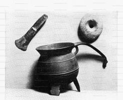 The third photograph herewith illustrates the following relics:—A mediaeval bronze skillet found near Langrigg during the construction of the Maryport and Carlisle Railway (completed 1845); a bronze paistave found by the late Mr. Jas. Cape at Seaton, probably 45 to 50 years ago; and a stone net-sinker, found by the late Mr. Jon. Mason at Seaton, about 25 years ago.