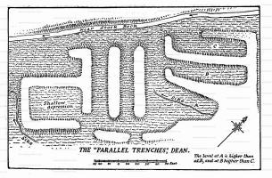 At the foot of the slope are the parallel trenches referred to by the late Mr. W. Dickinson (Trans. o.s. iii. 345). They are parallel excavations (see accompanying plan) but for what purpose they were constructed remains an enigma. They appear to be much later than the British period, and it has been suggested that they may have been medieval fish-ponds. Their water-logged condition and proximity to the old church and manor house give.colour to this view, but the theory is not completely convincing.