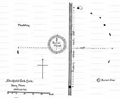 It is oval in form and measures 115 ft. by 93 ft. the longer axis pointing east and west. It is now cut through about the centre by a modern stone wall on the west side of which is a dense plantation. At the present time there are only 7 stones standing in the field, one of the largest being incorporated in the wall. The most northerly stone only showed slightly above the turf, but when bared it proved to be the largest of the group, measuring 4 ft. 7 ins. by 2 ft. 6 ins. Along the southern sweep of the circle was found, buried at a depth of 12 ins., another large block 36 ins. by 32 ins. There is only one stone standing in the plantation, but Mr. Robertson-Walker, the owner of the wooded half of the circle, distinctly remembers many more stones standing there.