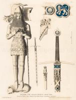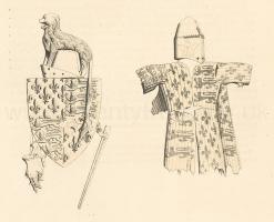 The military accoutrements of the Black Prince which are suspended by an iron rod above the tomb, are extremely curious; they are, perhaps, the most ancient remains of the kind existing, and, as might be expected, convey information on points which, but for such evidence, can be gained but by inference. The shield fastened to the column at the head of the tomb, is of wood, entirely covered with leather, wrought in such a manner, that the fleurs de lis and lions stand forth with a boldness of relief and finish, that when we consider the material employed, is truly wonderful; at the same time possessing even to this day a nature so firm and tough, that it must have been an excellent substitute for metal. This is, beyond doubt, the celebrated Cuirboullia, so often spoken of by the writers of the time. The surcoat, till closely examined, gives but little idea of its original splendour, as the whole is now in colour a dusky brown; it has short sleeves, and is made to lace up the centre of the back; its outward surface is velvet, once quarterly az and gules, upon which is richly embroidered with silk and gold, the lions and fleurs de lis; the whole of the surcoat is quilted, or gambased with cotton, to the thickness of three quarters of an inch, in narrow longitudinal portions, and lined with linen. It is remarkable, that there is no file either on this surcoat or the shield. The helmet is of iron, and has been lined within with leather; besides the sights tor the eyes, it has on the right side in front, a number of holes drilled in the form of a coronet, for the purpose of giving air to the wearer. The chapeau and leopard upon it, appear to be formed with cloth, covered with a white composition. The leopard is gilt, and the cap painted red; the facing white, with ermine spots, the inside lined with velvet. The gauntlets are brass, and remarkable for their similarity to those represented on the hands of the effigy, with this exception, that they have in addition, leopards, standing erect on the knuckles; the leather which appears on the inner side is ornamentally worked up the sides of the fingers with silk. The sword is said to have been taken away by Oliver Cromwell. The sheath which contained it yet remains, it appears to be leather, has been painted red, and ornamented on the outer side with gilt studs. There is yet a portion of the belt with the buckler attached; this belt is not of leather, but of cloth, the eighth of an inch thick, such as has been before noticed as used in fastening the spurs on the tomb of William de Valence.