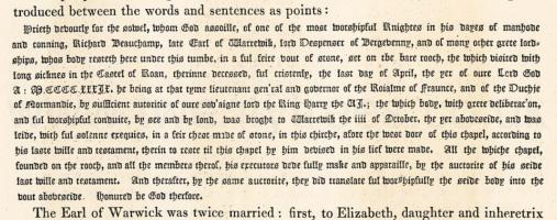 The Earl of Warwick was twice married: first, to Elizabeth, daughter and inheretrix of Thomas Lord Berkeley; secondly, to Isabella, daughter and inheretrix of Thomas Lord Spencer, Earl of Gloucester. By his first wife he had three daughters; by his second, his son and heir, Henry, above mentioned.