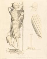 THIS effigy lies on an altar-tomb canopied by a gothic arch and pediment, on the south side of Minster Churchy in the Isle of Sheppy. Sir Robert de Shurland, Lord of Shurland, in the parish of Eastchurch, adjoining Minster, was the son of Sir Geoffrey de Shurland, who was Constable of Dover Castle in the time of Henry the Third. Sir Robert was Lord Warden of the Cinque Ports, and was made a Knight Banneret by King Edward the First, for his brave deportment at the siege of Carlaverock in 1300, and was probably a benefactor of the monastery of Benedictine Nuns at Minster, in Sheppy. He died without issue male., and Margaret his daughter carried his estate by marriage to the family of Cheyné. To the horses head which appears on this tomb, and on the vane of the church, is attached a wild legend, only worthy of notice as such, that Shurland having in a transport of rage caused a priest to he buried alive, a judicial process was about to be instituted against him for the crime, when the King chancing to be on ship-board at the Great Nore off the Isle of Sheppy, Shurland swam his horse to the vessel, sued to the King for pardon, which in consequence of this perilous feat he obtained, and his gallant steed bore him safely to the land. On reaching the beach, a wrinkled hag accosted him, telling him that although that horse had saved his life, he would at last be the cause of his death. The impetuous Shurland, to defeat the prophecy of this sybil, drew his sword, and on the spot slew his generous courser, whose bones lay bleaching for years after on the strand. Shurland one day approached the place, and while relating the story to a friend, kicked the scull of the horse, when a splinter from the bone entered his foot. The wound festered, mortified, and death ensued. Thus much for the tale; unfortunately for the credit of which, the horse's head appears to be led by the bridle by an armed figure, perhaps the knight's henchman? or his esquire. Be this as it may, the horse is but a mark of his equestrian rank; and it may be observed that a figure of a similar age, leading a horse, may be seen at this day near the west door of Exeter Cathedral [Map]. The horse's head on the vane of the church has most probably been fixed there in later days, in compliance with the vulgar tradition. The costume and accoutrements of this effigy are highly interesting. The interior of the shield, and all its straps, are displayed. By his side is his banner, attached to a pike-stuff, or spear. Some markings of links appear on the horse's head, which show that it has been covered with chain-mail. The surcoat, or pourpoint, appears strongly quilted in long parallel folds. The whole has been painted with lions rampant argent on an azure ground, which was the coat of the noble family of Leybourne, of Leybourne Castle, in Kent. Sir William de Leybourne was at Carlaverock, and Shurland probably assumed his coat as a Kentish gentleman in his trainsa