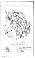 There are on Cefn Bryn other objects of interest besides Arthur's Stone. They do not strike the eye or fancy of the uninitiated, but yet, to the archaeologist, they give food for thought and a field for his imagination to play upon. Cams abound on this part of the hill round Arthur's Stone, especially to the S. and S.W. of it, on the summit of that spur of Cefn Bryn of which I have spoken. There are on Cam Llecharth, above Pontardawe, a cromlech (now dismantled) and a number of carns, a dozen or more in the neighbourhood, but I know of no instance where so many are scattered round a cromlech as here on Cefn Bryn. I should say it is a very unusual if not a unique instance. Sir Gardner Wilkinson made a small map of the hill—a copy of which is reproduced. He says there are upwards of eighty carns, and remarks that this " great number of carns in that locality show that it was selected as the most appropriate spot for the burial of the dead in early British times." It does indeed seem as though it had been an ancient burying place, as though, perhaps, it was an object of ambition or desire that one's bones should be near the great monument, as it was among the Jews that their last resting place should be as near as possible to the walls of the temple of Jerusalem. Sir G. Wilkinson says: " The hill has the appearance of a large cemetery, the tombs or carns of which are evidently of very great age. They are not remarkable for their size, being only from 12 to 15 feet in diameter, and of inconsiderable height, though considerably reduced in size by time and accident since they were put up; but the carn which stands about 355 feet to the west of Arthur's Stone is of much greater size and importance than the rest, measuring about 68 feet in diameter. Though it does not appear to contain a cromlech, like the neighbouring one which covered Arthur's Stone, it is little inferior to it in size; and the excavations made in its centre, if persevered in, would probably have disclosed a carn (I suppose he meant a cist) or indications of the spot where the body was burnt. A little below it, to the southward, is a hollow, evidently excavated for some purpose, about 155 feet long by 68 feet, which is filled with water in the winter but dry in summer, and this I suppose to have been made in excavating the earth required to form the great tumulus, for it is a tumulus rather than a carn, the rain of ages having washed away the earth, leaving only the stones we see there.