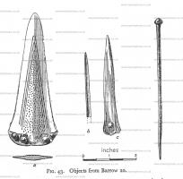 No. 20 is another, intermediate in size and position between 18 and 19. It produced a splendid sepulchral urn which was broken [and does not, therefore, seem to have been kept]. On removing the fragments we discovered an interment of burned bones, over which was a considerable quantity of decayed linen cloth, the filaments of which, at first sight, appeared like hair. This deposit was accompanied by a round pin (Fig. 43, B) and an arrowhead [sic] of bone (Fig. 43, c), and a very perfect spearhead of brass [sic, for ' bronze'] (Fig. 43, A), with a great part of the wooden handle adhering to it, by which we were enabled clearly to see the mode by which it had been fastened.' The perforated bone implement is certainly not an arrowhead, whatever its use may have been; and the bronze knife is of a kind typical of the Early Bronze Age.