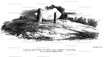 To return however to the tumulus itself. It is of a long oval form, ranging nearly due east and west, measuring somewhat more than 180 feet in length, by 90 in greatest breadth. Its present greatest elevation is about six feet; but, being in a ploughed field, it has lost somewhat of its original height in the memory of those living, and the rude sketch of Aubrey, seems to shew that, two hundred years since, its elevation, towards the east end, was much more considerable.1 The south side of the mound is still somewhat steeper and more defined than the north, a character which was much more marked as late as the year 1821, the date of the sketch from which our view is taken.2 The most remarkable feature is the trilith, or cromlech of three large stones, at the east end, which still give its name to the field.