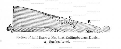 Eastward of this group of barrows, across the road leading from Collingbourne to Salisbury, in the direction of Windmill hill, there are two small barrows [Collingbourne Ducis Barrow 14 [Map] and Collingbourne Ducis Barrow 15 [Map]] which were examined in November, 1861. At about one foot from the apex of one, were found a small Roman coin, much corroded, a piece of slate in which a hole had been begun to be drilled, and a fragment of Samian pottery. A few fragments of coarse dark pottery were scattered about the mound, indicating a previous disturbance. Near to this barrow is a second, part of which has been removed in making a roadway. A large number of flints lay close under the turf, and among them were many fragments of two large urns (mouths downwards) of dark, coarse, and thick ware, which originally contained human bones. The urns rested on a layer, one foot thick, of large flints, and under tnem, in the centre of the barrow, was a circular hole dug in the chalk, two feet wide and two feet deep, containing a mass of charcoal and incinerated human bones. The bottom and sides of the hole were red and discoloured by fire.