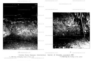 The greater part of the roof was found to have collapsed into the chamber, filling it with loose stones, but about 3ft. of roof over the back part of the chamber was intact, and beneath this and above the fallen-in rubble there still remained an open space.