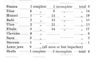 The complete bones are inclusive of those that it was found possible to mend. These bones are exclusive of those of the very young child.