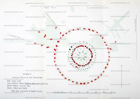 A trial trench, 6ft. wide, was dug from the lower limit of the area towards the Ridgeway, roughly parallel with the main road, and on the third day when hopes were running low, two stone holes that proved to belong to the outer ring were found, and the position of the circles thus established, work went on uninteruptedly until all the holes of the two stone circles, and those of the hitherto unsuspected post hole rings, were uncovered.