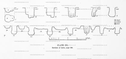 Where the cores in the outer part of the holes were well enough defined to see, the timbers seem to have been about 12 to 14 inches in diameter, and rather less on the inner side. The cores were usually better defined in the outer than in the inner part of the hole, probably due to greater depth. In hole 10, two cores were particularly well defined, 1ft. in diameter and 2ft. apart from centre to centre, with a packing of hard chalk between. In this hole there were two roundish shallow depressions about an inch deep in the floor, apparently marking where the timbers had stood.