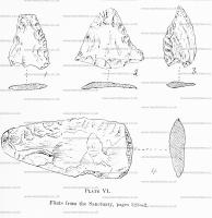A considerable number of small flakes and chips of flint were found in the surface rubble round about the holes 15, 16, and 19 of the Stone-and-post ring. These seemed to be debris of flint knapping. Some half-dozen or so scrapers were found on the surface, and one small barbed and tanged arrowhead, weathered white.