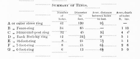 The inmost ring with a radius of some 6 feet, consisted of six deep round holes; the cores formed by the timber uprights were noticed in holes 3, 4, 5, and 6; these timbers seem to have had a diameter of about 12 inches.