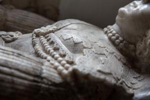 After 1630. Church of St Leonard, Rodney Stoke [Map]. Monument to Anne Lake Baroness Ros of Helmsley (deceased). Finely crafted in Watchet Alabaster. Stuart Hooded Monument.