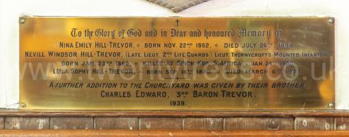 After 1890. St Mary's Church, Chirk [Map]. Memorials to the Hill-Trevor family including [his daughter] Gertrude Mary Hill-Trevor, [his son] Lieutenant Neville Windsor Hill-Trevor (age 20) and Arthur Edwin Hill aka Hill-Trevor 1st Baron Trevor (age 70).