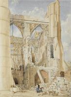 After 1834. George Belton Moore (age 27). "Stone masons working on the rebuilding of the south wall of St. Stephen's Chapel, Westminster [Map]" [following the fire which destroyed the building.]