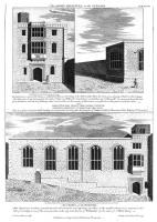 Vesta Monumenta. 1753. Plate 2.12. The prison and chapel buildings in the Savoy Hospital in 1736. The Hospital Chapel, depicted from two different sides in the lower half and the upper right portion of this plate, is the only Savoy building that survives today. Engraving by George Vertue (age 69) after his own drawings.