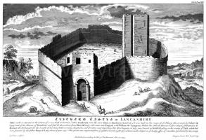 Vesta Monumenta. 1734. Plate 1.41. Lancaster Castle [Map] and Priory Church [Map]. Engraving by George (age 50) Vertue after a drawing originally produced for a survey of the properties of the Duchy of Lancaster conducted by the Chancellor of the Duchy, Ambrose Cave, in 1561.