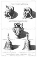 Vesta Monumenta. 1756. Plate 2.17. A Roman lamp, an amphora-style vase, and two hand bells from 1366 (left) and 1547 (right). Engraving by George Vertue (age 72) (his last for Vetusta Monumenta) after his own drawings.