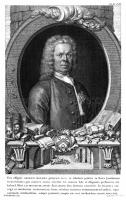 Vesta Monumenta. 1750. Plates 2.3. Portrait from around 1732 of George Holmes, a founding member of the Society of Antiquaries and Deputy Keeper of the Tower of London. The engraving augments the original oil painting by depicting a more mature Holmes surrounded by objects symbolic of his intellectual and professional pursuits. Engraving by George Vertue (age 66) after Richard van Bleeck.