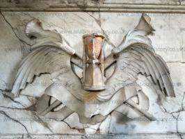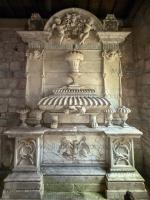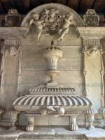 A huge monument in black and white marble, with a tall base on which stand obelisks, on balls capped by two black urns and a large open pediment. Within, are the Viscount and his fourth wife Elizabeth Bertie Viscountess Campden (age 42) in effigy and various low reliefs, depicting his previous wives and nineteen children, in Roman dress, completed by Grinling Gibbons (age 34).
