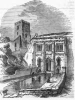 The spring rises from a bed of shingle at the foot of a steep hill, the water rushing out with great impetuosity, and flowing into and over the main basin into a smaller one in front. The well is enclosed by a building in the perpendicular Gothic style (dating from the beginning of the reign of Henry VII), which forms a crypt under a small chapel contiguous to the parish church, and on a level with it; the entmnce to the well being by descent of about twenty steps from the street. The well itself is a star-shaped basin, ten feet in diameter, canopied by a most graceful stellar vault, and originally enclosed by stone traceried screens filling up the spaces between the supports. Round the basin is an ambulatory similarly vaulted.1 The sculptural ornaments consisted of grotesque animals, and the armorial-bearings of various benefactors of the shrine; among them being Catharine of Aragon, Margaret, mother of Henry II, and different members of the Stanley family, the founder both of the crypt and the chapel above it. Formerly, the former contained statues of the Virgin Mary and St Winifred. The first was removed in 1635; the fate of Winifred's to which a Countess of Warwick (1439) bequeathed her ruset velvet gown, is unknown. On the stones at the bottom of the well grow Bissus iolethus, and a species of red Jungermania moss in the vulgar tongue as Winifred's hair an blood. In the seventeenth century St Winifred could boast thousands of votaries.