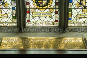 After 1911 St Mary's Church, Chirk [Map]. Window by Burlison and Grylls, commemorating the Hill-Trevor family including Mary Catherine Curzon Baroness Trevor (age 73), [her grandson] Charles Edwin Hlll Trevor 4th Baron Trevor and [her grandson] Nevill Edwin Hill-Trevor.