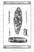 In this tumulus, three persons were interred; the primary deposit must, of course, have been the skeleton lying in a cist, excavated within the chalk; the second was probably the wife of this person, lying with her head at his feet; and the third and last, might have been their son. The drinking cup found at the feet of the primary interment, is large, and holds more than a quart; resembles in form and manufacture many of the others; is made out of poor clay, intermixed with bits of chalk; yet it is profusely ornamented, and in a different style to any we have yet seen. How such a multitude of indentations could be put on the surface, while the clay retained its flexibility, is surprising; for it is very clear, that these ornaments were put on singly, and most probably by a bone instrument. The sharpness and nicety to which this spear head of flint, as well as the arrows of the same material, have been chipped, must also strike the attention of every observer. Yet we know them to have been made use of, by all barbarians, for destructive purposes. Neither must the aforementioned stone be passed over unnoticed; it is very neatly polished, feels silky, and, at. first sight, looks something like fossil wood: it is striped irregularly, with dark green and white, and its proportions will be ascertained by the annexed engraving, Plate XVII. which represents both the spear head and stone, of their natural size. Mr. CUNNINGTON thinks it is of that' species of stone called by KIRWAN, ligniformed asbestos, and that it may have been considered by the Britons as of high value, from its supposed virtues.