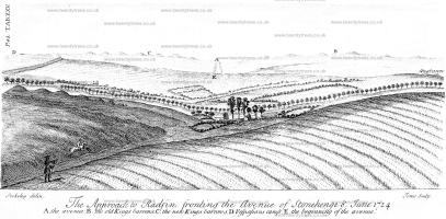 Stonehenge by William Stukeley. In order to have a just notion of this avenue, it is necessary to go to the neighbouring height of Haradon hill [Map], on the other side the river. The largest barrow there, which I call Hara's and which probably gave name to the hill, is in the line of the avenue; the ford of Radfin lying between, as we see in the last Plate. I stood upon this hill May 11. 1724. during the total eclipse of the sun, of which I gave an account in my Itinerarium. Here is a most noble view of the work and country about Stonehenge. Whoever is upon the spot cannot fail of a great pleasure in it; especially if the fun be low, either after rising or before setting. For by that means the barrows, the only ornaments of these plains, become very visible, the ground beyond them being illuminated by the suns flaunting rays. You fee as far as Clay-hill beyond Warminster 20 miles off. You fee the spot of ground on the hill, whereon stands Vespasians camp [Map], where I conjecture the avenue to Stonehenge began, and where there was a facellum, as we conceive. From hence to that spot a valley leads very commodiously to Radfin [Map], where the original ford was.